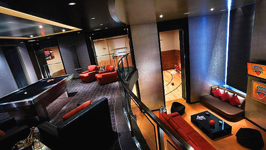 这个面积为10000平方尺的两层楼套房是篮球运动员的天堂,配有室内篮球场,更衣室, 记分牌和巨大的折叠床。