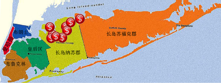 长岛位于美国东海岸,属于美国纽约州,是纽约市东南一片狭长形的岛。南北两岸最宽距约公里。东西长约190公里,从最西边的大颈镇到最东头的海景度假胜地蒙陶克需两个多小时高速路车程。长岛自然条件绝佳,有三面濒临大海,风光十分秀美。碧水拍打的细沙海滩、高耸醒目的海岸灯塔,远近闻名的葡萄酒庄,古色古香的历史小镇、世界闻名的古堡豪宅及经典的英伦庭园长岛的西界邻接纽约市皇后区,距离全世界最忙碌最繁华的商业金融中心曼哈顿仅有20英里。您从钢筋水泥林立的中城驾车三四十分钟后,就已经完全置身于这处绿树环绕,百鸟啼鸣的世外桃源了。这,也就是为什么数不胜数的富豪及实业家不断来此落户的原因。他们所拥有的财富和实力也在不断地把长岛打造得越来越超凡脱俗!美国商业周刊在前两年评出的全美最富25镇中,纽约长岛傲然有9镇名列其中,论总体富裕水平,美国其它地区无一能及
