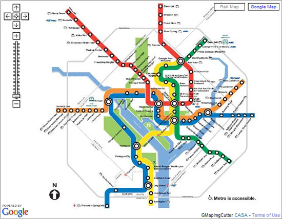 自1976年开通以来,华盛顿地铁已经发展至5条线路,共有86个车站及171公里长的轨道。和日本东京地铁相比,华盛顿地铁线路一点也不复杂,5条线路设计成辐射状,以便于地铁从城市的任一地方前往城市周边地区。不过,这种设计特别不利于周边地区之间的往来,比如说Maryland州和Virginia州之间的往来,目前这两个州也各自拥有各自的公共汽车交通系统。据说华盛顿的有关单位已经提出了紫线计划以矫正这一弊病。