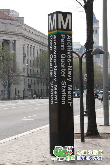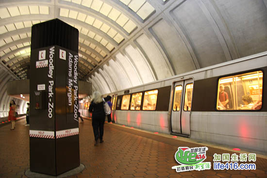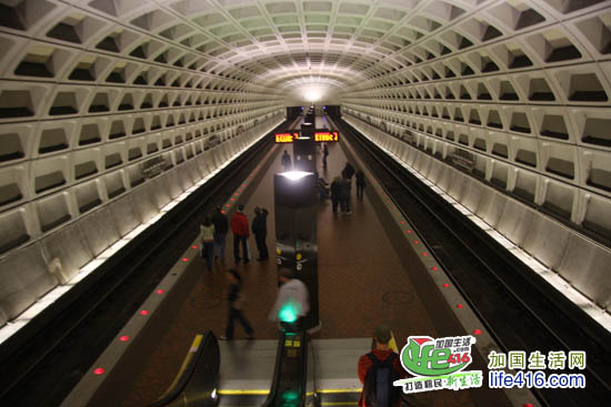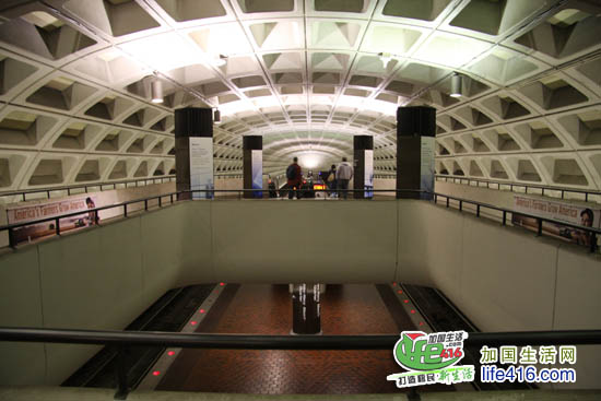 当你走在华盛顿大街上,看到这样的路牌,就表示这个路牌旁的某处就有地铁的入口第一次进入地铁站,你还会有点不太适应,因为与其他城市的地铁站相比,华盛顿的地铁站里太暗了。慢慢地,你会被华盛顿地铁站的庞大而高耸的穹顶的吸引,感觉象是进入了外星人建的太空城。