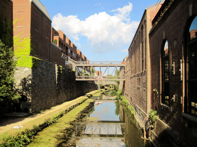 乔治城第一印象是很像洛杉矶地区的帕萨迪纳(Pasadena),没有什么高楼大厦,街区却十分热闹,是购物、休闲和美食的天堂,也有不少历史遗迹。位于Potomac River河畔、华盛顿特区西北的乔治城确是一个历史悠久的地区,在17世纪的时候由英国皮货商人占据,成为区域内商贸集散地,归属于英国的马里兰殖民地管辖,到1751年马里兰殖民地从George Gordon和George Beall手上购买了市镇的大部分土地,正式建立了城市的行政区划,当时的英王也是George II,所以城市就命名为Georgetown了。到19世纪开始,Potomac河淤泥增多,货运船只无法通航了,于是Chesapeake-Ohio运河开建,一端是现今West Virginia州的Harper's Ferry,另一端就是Georgetown,虽然这条耗资巨大的运河从来没有完成预期的收益,但仍给Georgetown带来了短暂的繁荣,一时间商旅络绎不绝。华盛顿DC特区建立后,包括了Goergetown和华盛顿市(City of Washington),后者建市其实还比乔治城更晚了40年,二者一直到1871年之前都是相互独立的。1871年与华盛顿市合并,1895年废除了乔治城剩余的当地法令,并以华盛顿市为基准重新命名街道(按字母、数字排列,从华盛顿市开始)