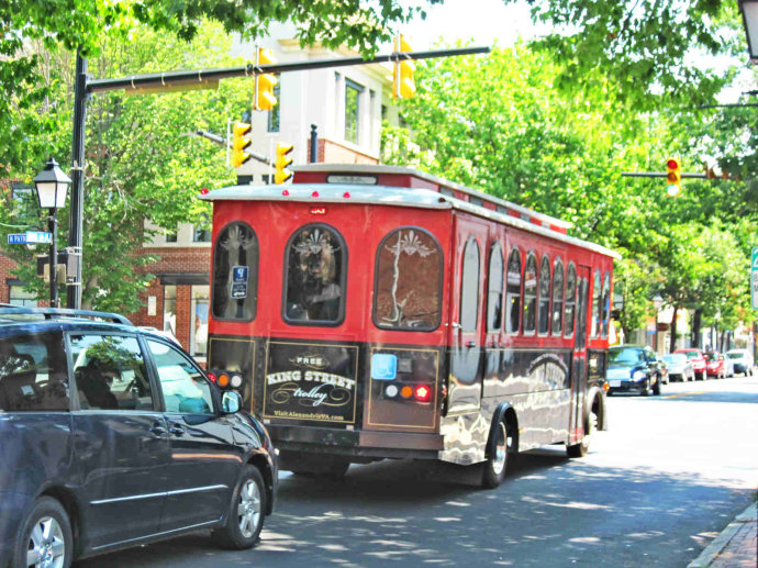 从火车站到河滨就是主要的游览区,只有15-20条街区的距离,步行穿过去1.2英里,25分钟,如果不想走路,也可以乘坐trolley,就在火车站出站口(铁路东侧靠近老城一侧)公交转乘区域有站点,trolley是免费乘坐的,在King Street上河滨和火车站之间往返,沿途每个路口都有站,运营时间11:30am-10:15pm,每15min一班,周六周日不休息
