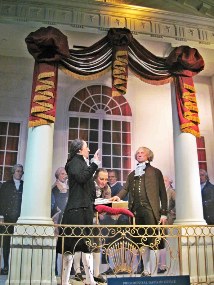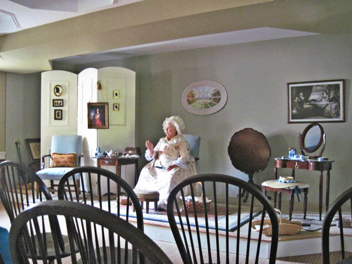 有个房间里正有个工作人员装扮成华盛顿的夫人给游客讲故事