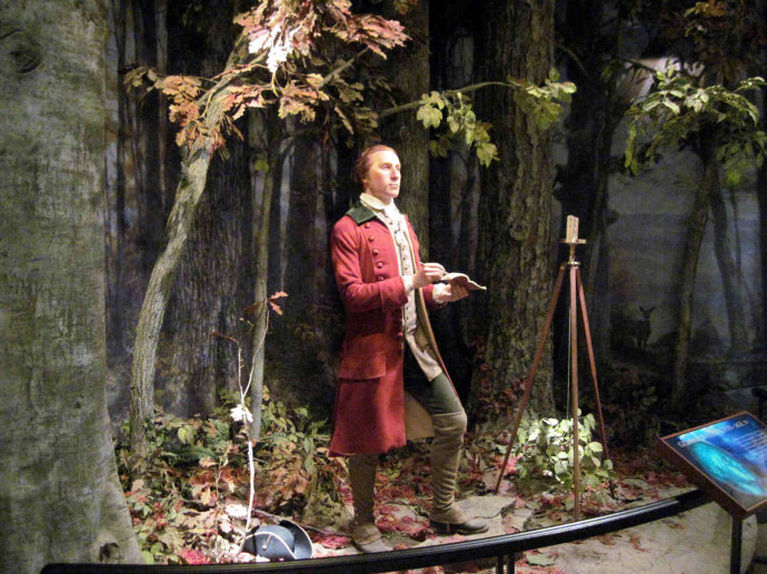 从mansion之前的草坪经过,正看到工作人员开始往外赶人,要下班了,于是又回到了刚进门时候的路,因为赶去参加mansion tour,在进门处的education center就忽略了,现在因为这里的展览关门比mansion晚,我就有时间仔细看看了。展厅布置的很仔细,也应用了很多高科技手段,通过照片、文物、影片等展示华盛顿的生平以及弗农山庄的历史