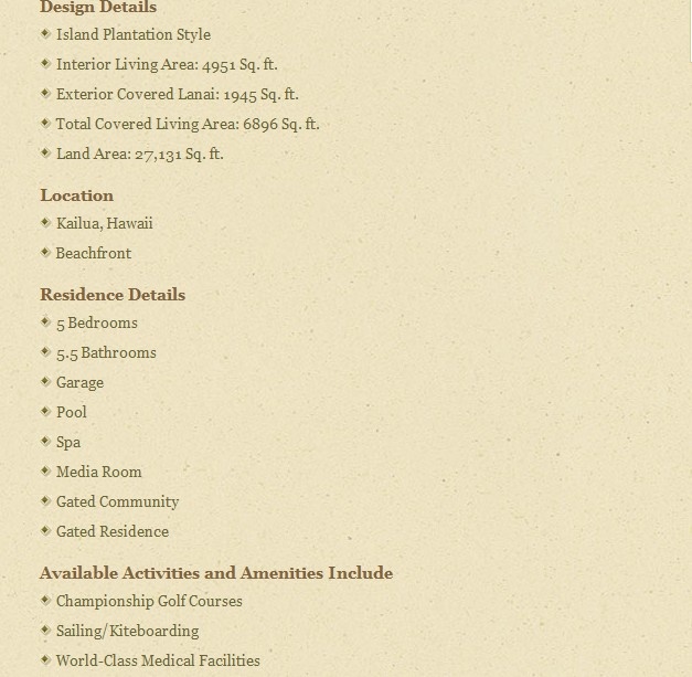 这座豪华别墅位于夏威夷凯卢阿(Kailua, Hawaii),这座5,000平方英尺的别墅是奥巴马总统及其家人过去三年(2008~2010)的冬季度假胜地,并因此得名“冬季白宫”。