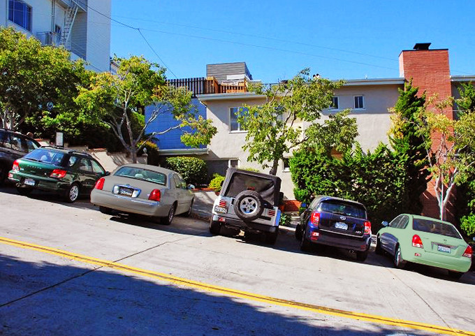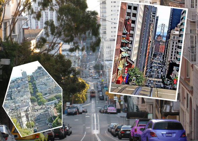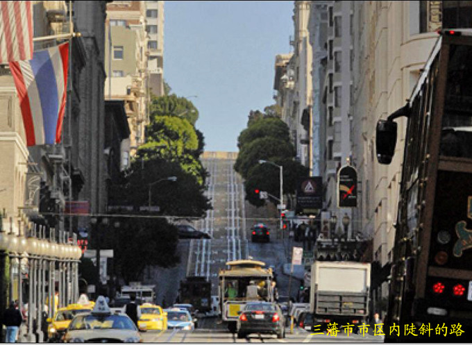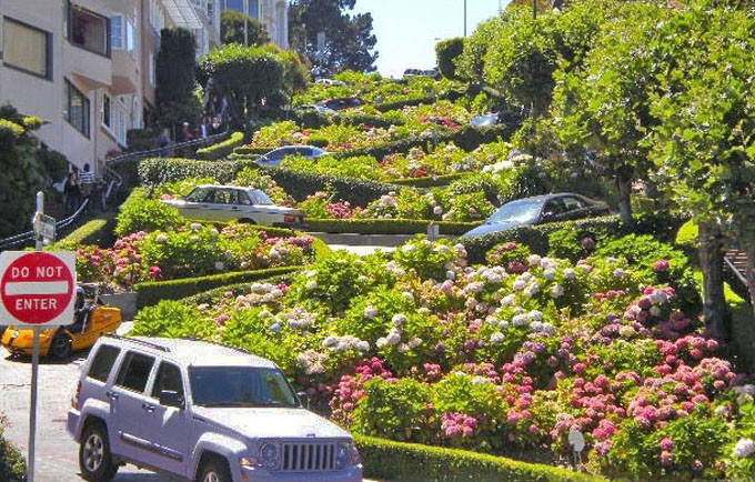 三藩市位于圣弗朗西斯科半岛的最北端,地形有点象我国的重庆,是一座山城,这里的道路基本上不是上坡就是下坡,不少道路还比较陡,坡度达20多近30度。有一段路是个大下坡,为了防止交通事故,特地改成有八个 “之”字形拐弯盘曲而下的路,在两旁筑上花坛,这就是现在成了三藩市一道独特风景线的九曲花街(Crookedest Street)。