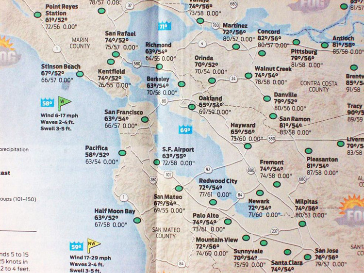 上图是7月25日登载于湾区报纸上的天气预报图,可以见到,旧金山海湾周边地区的最高气温仅在63~74oF(17~23℃)之间,而同日广州的最高气温达35 ℃。此时在广州,即使你坐在房间内不动,甚至是吹着电风扇也会是成身“黐立立”的,若稍作活动或到户外阳光下站着,那汗水就来过大珠小珠落玉盘,不用几分钟,浑身湿透无干处。在广州的夏天,有的人甚至认为没有了空调简直就无法活。若在湾区,虽然在阳光下走动时你会有点热感,但摸摸身上和衣服,却是干爽爽的,没有半点汗湿,一旦你站到树阴或屋阴下,你立马就感到空气是凉爽的,三个字:舒服晒。