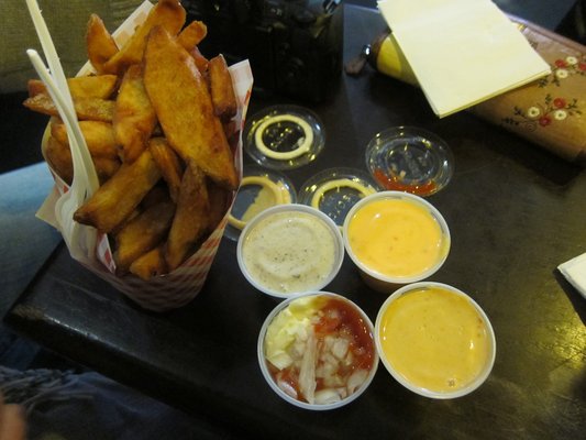 这是一家卖比利时式薯条的店,薯条外脆里嫩。他们提供的蘸酱的种类非常多,而不是美国绝大多数餐馆提供的番茄酱(ketchup)。薯条是4.5美元一份,蘸料另加1美元。