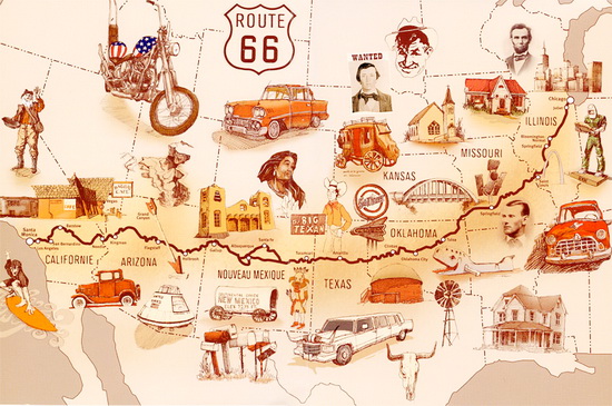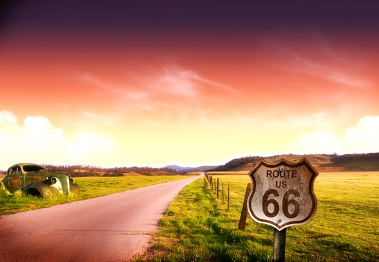 如今已不存在于美国公路地图上的66号公路,可说是20世纪上半叶最为风光的一条公路,开始兴建于1927年,隶属于美国的公路系统,直到1938年才宣告完工。此公路由芝加哥一路连贯到洛杉矶,甚至还向南延伸至圣塔蒙尼卡(Santa Monica)。途经伊利诺州、密苏里州、堪萨斯州、奥克拉荷马州、德州、新墨西哥州、亚利桑那州以及加州;全长2448哩(约3939公里),横跨八大州、三个时区,串联并缩短了当时美国中西部到西岸的路程。