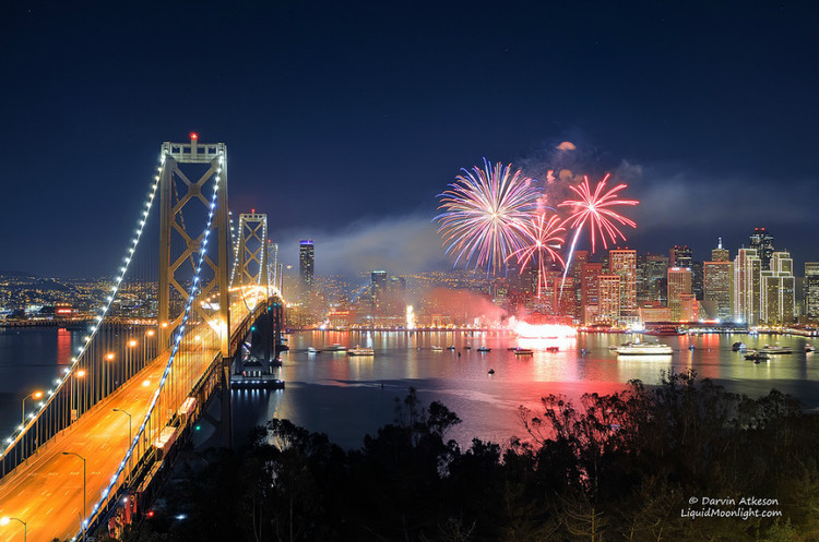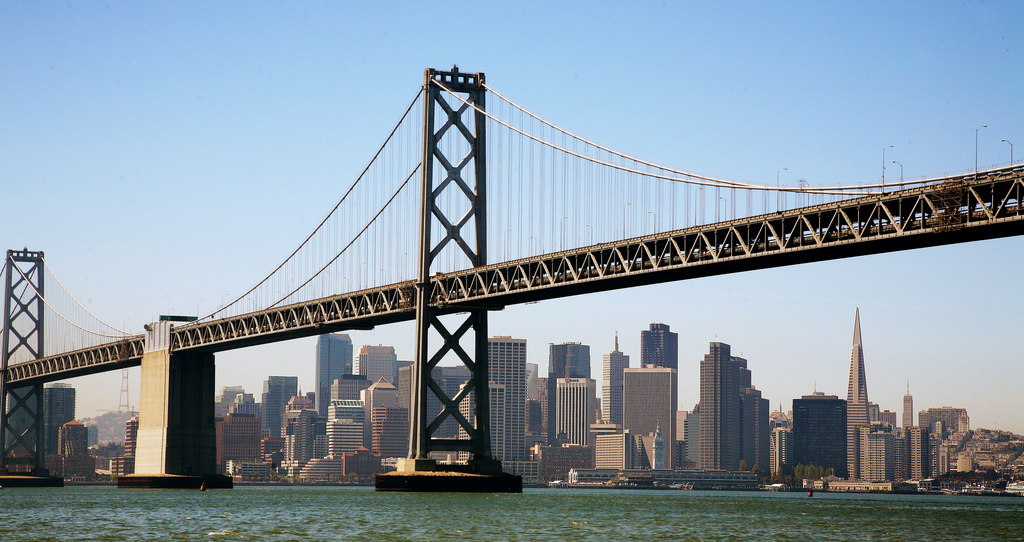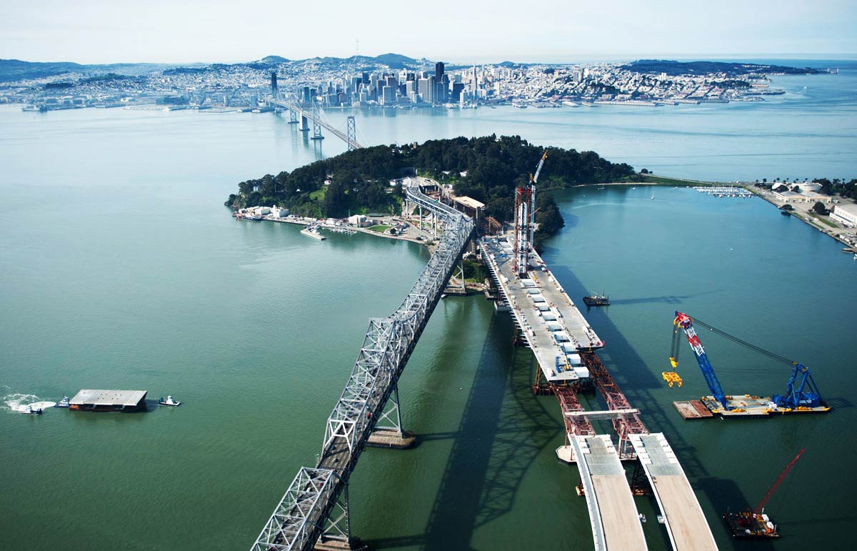 海湾大桥由东西两部分组成,分别连接耶尔巴布埃纳岛(Yerba Buena Island,当地又称芳草岛,是一个天然露出底层岛屿,坐落在旧金山湾湾口中央)的东西岸和旧金山市、奥克兰市。西桥是一座由四座索塔组成的悬索桥,拥有六个桥跨,连接芳草岛和旧金山市。旧金山市的林孔高地(Rincon Hill)顶部充当西桥的锚碇,同时也是海湾大桥西桥到旧金山的着陆点,通过三条小桁架桥与市区路段相连接。在芳草岛和奥克兰市之间的东桥则是一座悬臂桥,由两座桥塔、五个桁架结构桥面和一条14节的桁架公路组成。海湾大桥在芳草岛上的部分由四段组成:紧接在西桥悬索锚碇的东面的,是一段98米长的混凝土高架桥,然后连接一段160米长、穿过芳草岛中心岩质山丘的隧道,之后是另一段241米的混凝土高架桥,最后通过一条长356.5米的弯曲的钢桁架高架桥连接到东桥桥面。将东西两座桥连接起来的芳草岛隧道长160米,宽23米,高18米,是世界上直径最长的运输用钻孔隧道。