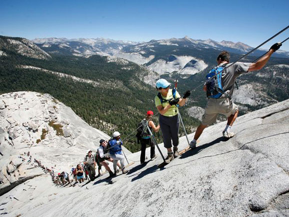 攀爬4800英尺(约1.4公里),您会经过约塞米蒂谷、韦纳尔瀑布和内华达瀑布。但之后的900英尺(约274米)则需徒步经过半月丘花岗岩的表面。幸运的是,会有钢索帮您一把。