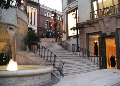 比佛利山面积不大,居民只有三万二千人,因此可以步行慢慢品玩。最让游客感兴趣的是以名店购物著名的Rodeo Drive.这里是流行时尚中心,此地商店与财富及明星画上等号,电影麻雀变凤凰就是以次为背景拍摄的。Rodeo Drive是流行時尚中心,此地商店與財富及名星劃上等號,電影麻雀變鳳凰(Pretty Woman)的電影場景就是以此為背景.香乃尔,克莉斯汀迪奥,Tiffany及Gucci等世界名牌云集,价格贵得令人望之怯步。每一间名店,都有其独特建筑风格。