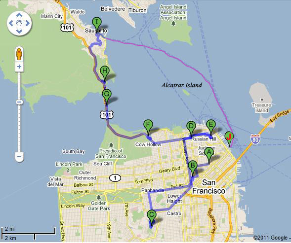 A,联合广场(Union Square)→ B,市中心广场(Civic Center Plaza)→ C,双峰岭(Twin Peaks)→ D, 九曲花街(Lombard Street)→ E,电报山(Telegraph Hill)→ F,艺术宫(Palace of Fine Arts)→ G,金门大桥(Golden Gate Bridge)→ H,金门大桥观景台 → I,索萨利托(Sausalito)→ J,渔人码头(Fisherman's Wharf)