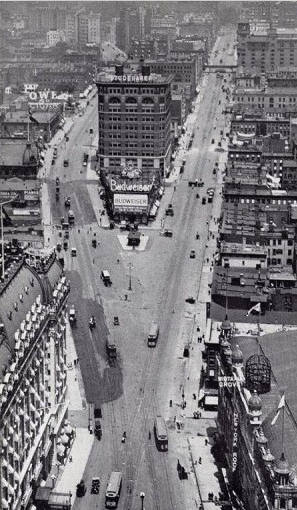 Now, what I love about today's photo is that we have an opportunity to see the tree before it was trimmed back to its current sad state; it's right there near the middle of the image. Of course the trunk is noticeably bulkier in the modern image, but you can clearly see the original tree in the 1905 photo as it follows the same path. You can also notice that the fountain changed. The current one is a modern reproduction of the original from the mid 1860's. Apparently that original fountain didn't make it to the early 20th Century.