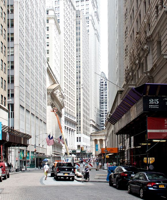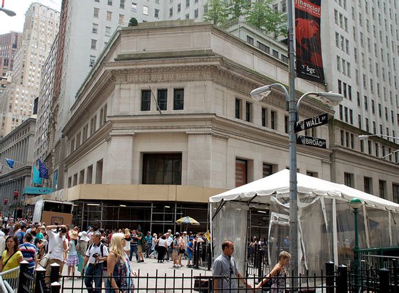 One of my favorite geographical fallacies is that of the New York Stock Exchange being on Wall Street. Sure, the building itself is right on the corner of Wall Street, but the main face and colonnade so often associated with the NYSE actually sits on Broad Street – a more impressive-looking street in my opinion, and one that often is misidentified as Wall. A more historic building, Federal Hall, sits on Wall Street proper and is visible from Broad. The steps of this building were the site of George Washington's first inauguration.