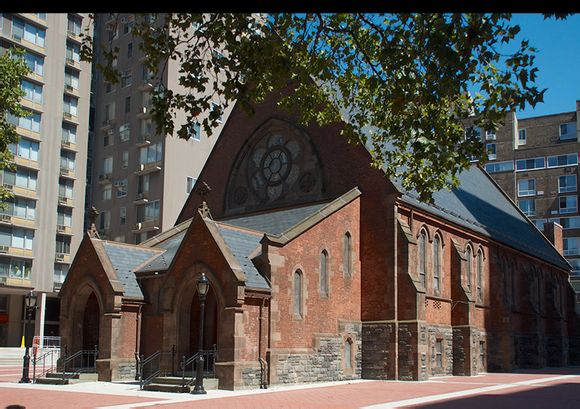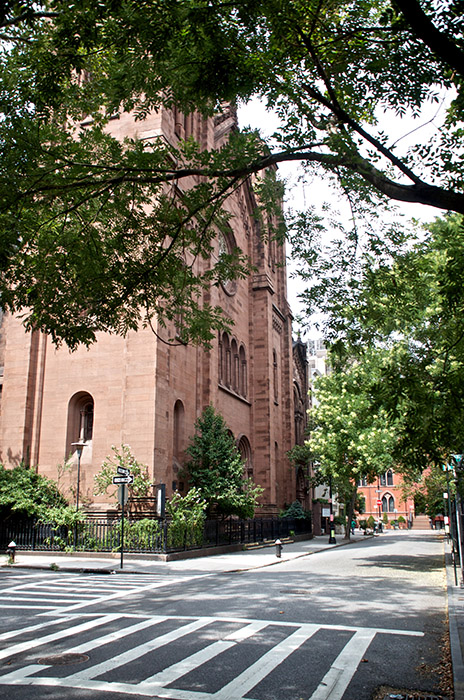 Known for many years as "Morgan's Church" thanks to parishioner J.P. Morgan, St. George's Episcopal Church has sat on the edge of Stuyvesant Square since the mid 1800's. Originally built with twin spires, they were removed in 1889, leaving the rather stunted appearance we have today. On the far right side of this picture you can catch a glimpse of Stuyvesant Square's original 1847 cast iron fence, which is the second oldest surviving fence in the city – after Bowling Green's