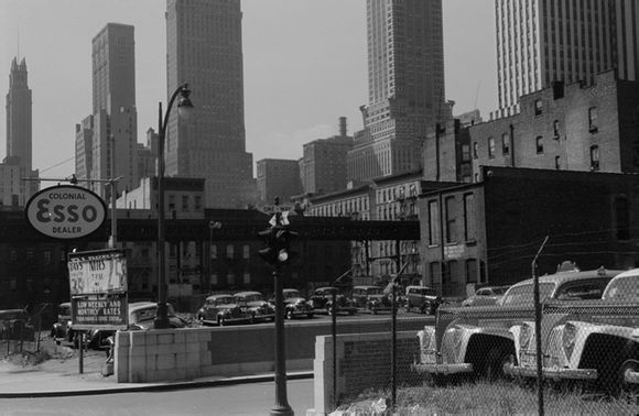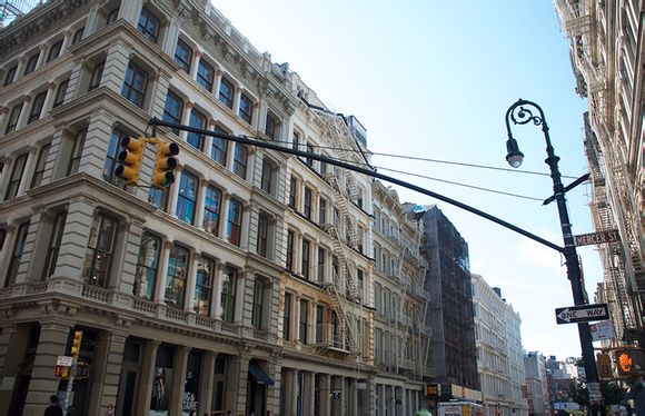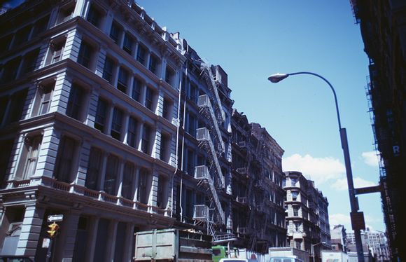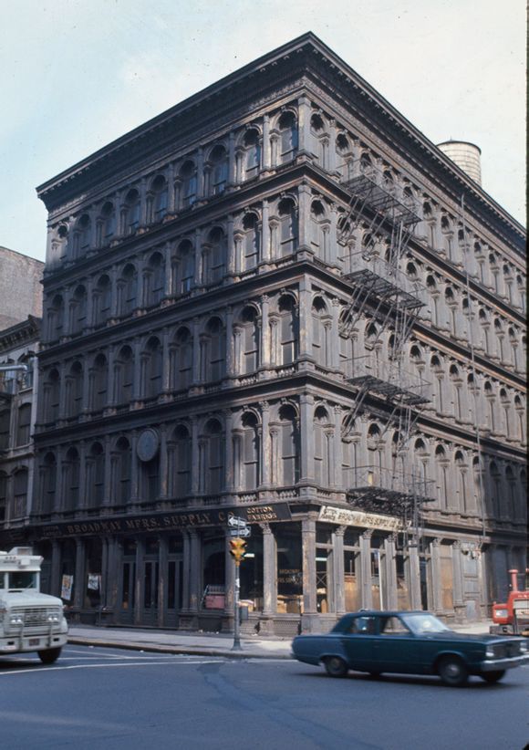 Throughout the 1940's and 1960's the neighborhoods that would later become SoHo and Little Italy were under a constant threat of demolition due to the unrelenting power of Robert Moses and his plan to build the Lower Manhattan Expressway. Though this part of Manhattan is now an expensive and chic neighborhood, that was hardly the case 50 years ago when the former factory hotbed was in a deep localized depression. The expressway plan was aggressively pursued by Moses and it was only thanks to the tireless efforts of preservationists like Jane Jacobs that LOMEX, as it was known, was finally derailed. However the plan made it far enough that many individuals photographed the cast iron facades of Broome Street and other surrounding blocks, anticipating their demise. This is one such photo. Thanks to the thoughtful urban planning of Jane Jacobs and others we now have the opportunity to enjoy a renewal in this unique architectural neighborhood.