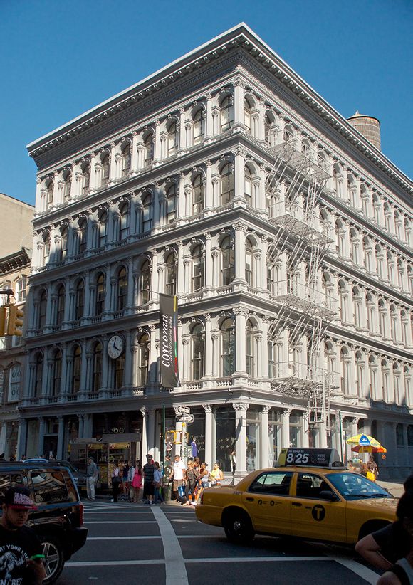 The Haughwout Building is a unique landmark in many respects. Built in 1857, the corner building required two cast iron facades - which would normally be too heavy for structures of the time. The designer and builder convinced the owner of the building to allow them to use the cast iron decoration to support the building itself. This was a new engineering idea at the time. It would be another 50 or so years before steel-framed buildings expanded on the concept and spawned the skyscraper boom of the 20th century. Another skyscraper-friendly idea that was well ahead of its time was the inclusion of an elevator, installed by Elisha Graves Otis himself. It was powered by steam and was mostly a tourist attraction.