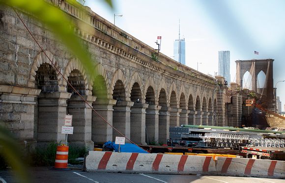 The Brooklyn Bridge is so unique and beautiful thanks partly to its over-engineering. The diagonal cables that run from the towers down to the road deck actually don't serve the make the bridge any stronger, but over the years they've become one of the many iconic features of the crossing. Recently, old bridges like this one have come under scrutiny as the deteriorating infrastructure in the United States becomes a larger issue. Fortunately, much of the aforementioned over-engineering has helped keep the the main span of Brooklyn Bridge is relatively good shape. What hasn't fared as well are the approach ramps, which are currently undergoing a multi-year rehabilitation. In today's photo you can see that this parking lot on the Brooklyn side has been commandeered by this construction project as a staging place for some of their materials.