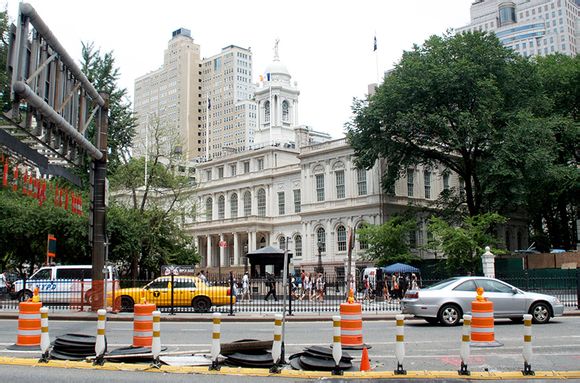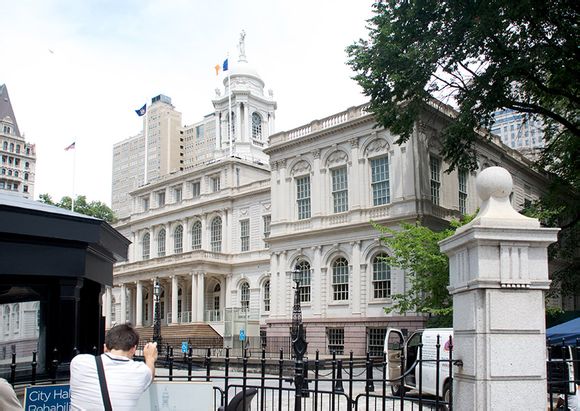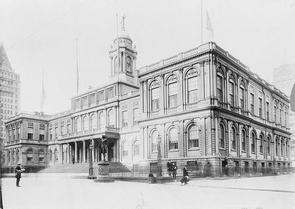 In the early 1800's the majority of New York City still existed solely below Chambers Street, so it made sense to build the new City Hall on the northern edge of that boundry facing south. Unfortunately for those early planners, the City just kept growing. Now we find ourselves with a City Hall whose back is turned to the majority of its population. (There's a political cartoon in there just waiting to happen.) To make matters worse they didn't even treat the rear of the building with the same respect as the front. The most visible parts at the time were clad in ornate white marble while the back was just simple brownstone. It wasn't until a renovation in the 1950's that the entire building was covered in the limestone that we see today. As a result, the old 1919 photo above is a completely different exterior than what you see in the 1984 and 2013 photos.