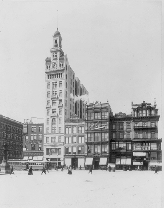 The tallest building of the block is Bank of the Metropolis, which is the best superhero name a building could possibly have. Completed in 1903, Bank of the Metropolis passed the Decker Building as the tallest building in Union Square and featured far more classical styling when compared to the eclectic details of Decker.