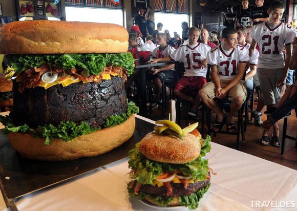 位于美国Michigan的Mallies Sports Grill & Bar餐厅推出的超级汉堡Absolutely Ridiculous Burger用的只是培根、生菜、番茄、芝士这类普通货色来烹调,之所以能够卖出近两千美元的高价,全因为它巨无霸的身材。重达338.6磅,这款汉堡需要22个小时才能完成,据说光是中间的肉扒就需要三个大男人才能抬进烤箱,不过这样的汉堡真的会有人想要吃吗?540,000大卡啊!