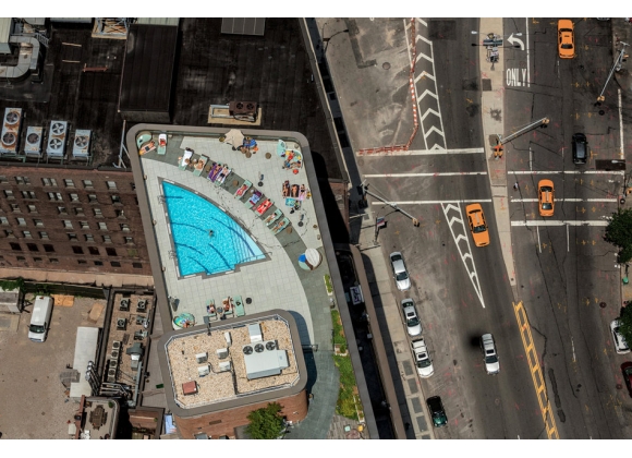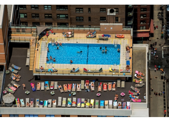我们嫉妒吗?泳池是功利主义的、有时甚至是笨拙的建筑,大多是为了体现它的专享性。真正的地产市场靠的是令人羡慕的便利设施。但是,先不谈嫉妒,只说那些用直升机俯拍出来的照片,它们有一种好玩的偷窥意味——城市景观向上伸展,变得陌生,散布在水波荡漾的泳池中或躺椅上的游泳者很像大卫·霍克尼(David Hockney)的油画。这些椅子也是有标价的。肉库区的梦想市中心酒店(Dream Downtown)周一至周四租用一天泳池要价175美元。周末租一个有凉台的小屋至少要收2500美元。图为第一和第二大道之间的东64街。