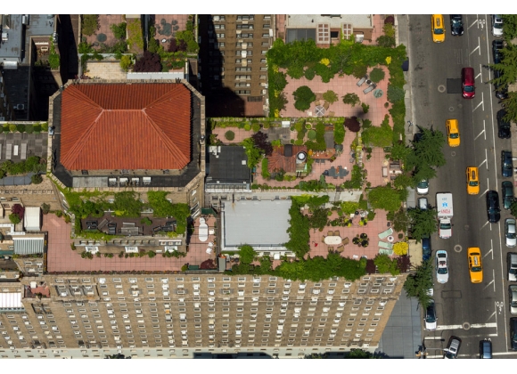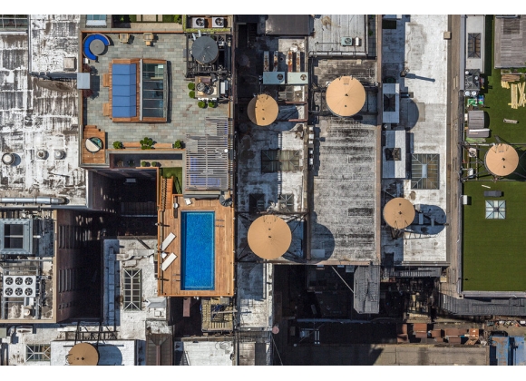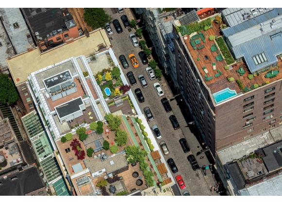 你可能不知道,但它们就在上面——那些蓝绿色的绿洲。我们这些每天忍受着夏天的酸腐味、闷热的地铁站台和灼热的人行道的人是看不见的。纽约把收入差距表现为垂直的城市规划,在这一点上它甚于其他任何城市。大部分人生活在街面上,当有空调的店面的门转开时,纵容自己在那里多停留一秒;而幸运的少数人待在秘密的屋顶上,穿着小小的三角形比基尼,懒洋洋地躺在泳池边。图为东八街和韦弗利广场之间的百老汇。