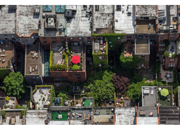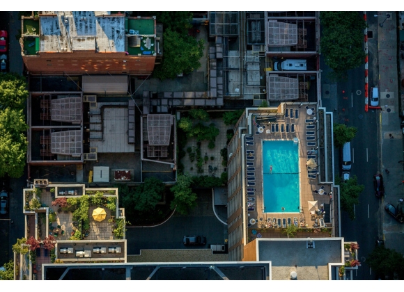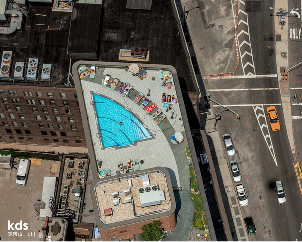 很久以前,城市里的夏季避暑方法就是故意破坏消防龙头,或者在安全出口打个盹。我在纽约长大时,最接近在屋顶游泳的活动是从二楼窗户往楼下的朋友们身上丢水气球,然后交换位置,让他们往我身上丢。当时的屋顶是粘糊糊的沥青荒漠,任何理智的纽约人都不会去那里避暑。屋顶泳池和足球迷一样是罕见事物。但是现在它们数量激增,成了公寓或酒店的卖点——说实话,开发商们很可能愿意修建更多赚钱的顶层公寓,但是有时必须达到麻烦的绿化要求。景色宜人的泳池把这种要求变成了优势。图为普林斯街和斯普林街之间的格林街。