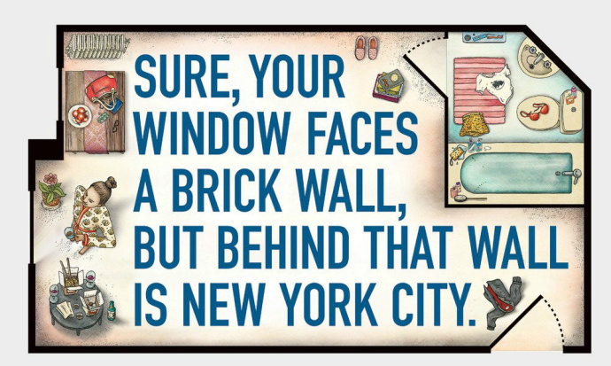 记得很多年前热播的一个讲述曼哈顿生活的电视剧叫做《欲望都市》,在第五季中,女主角在自己的专栏中写到纽约客的生活基本围绕着三件事:找工作,找房子,找对象。所以可见找房子对于纽约客来说是举足轻重的,而“租房”两字对于新New Yorker来说难免觉得有些老虎吃天。在纽约的一家房地产公司最新的广告中,一组弥漫整个地铁的漫画广告着实的戳中了每位纽约客的内心。住在纽约,你不得不承认......