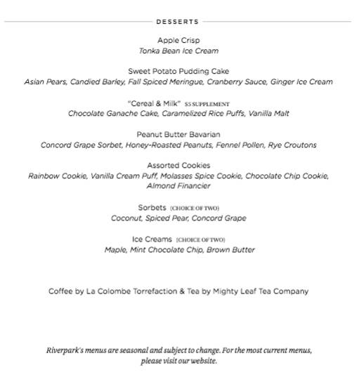 尝试过纽约餐馆周多家餐厅,让小编觉得性价比最高之一,日后还会前往的非RiverPark莫属。这里不仅能欣赏到哈德逊东河的宁静美景,还能品味到由餐厅农场直接配送的最新鲜食材制作的美式现代菜肴。无论是从地理环境、装饰设计还是菜品味道,极富情调的RiverPark都会带给食客惊喜。大力推荐创意甜品Cereal&Milk!!!
