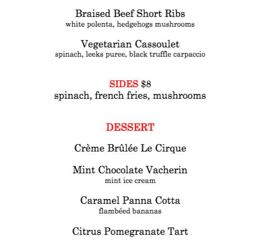 Le Cirque餐馆在纽约的法式餐馆中有着极高的地位,接待过无数好莱坞明星和政界要人,餐馆里随处可见名人照片,连名厨Daniel Boulud也是从这里发迹。富丽堂皇的装修在平时让人的心肝跟着钱包一起乱颤,餐馆周这么好的机会怎能不去尝试一下?