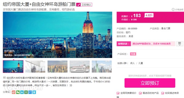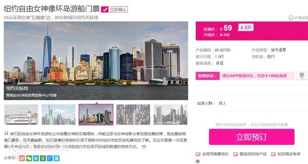 以海玩为例:我们可以看到不上岛,只是在船上观望自由女神的游船门票,只要人民币59元一人,这可比官方售价118元便宜了一半。
