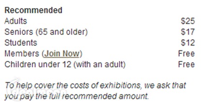 携带美国银行借记卡或信用卡可享受周末免费进入。并且许多博物馆的价格都是建议价格(Recommended),大家可以看下图。建议价格就意味着你不需要真的付那么多,但是你如果网上支付的话,官方就会默认为你同意这个价格,所以大家还是现场买吧,你有心支持博物馆当然可以,若是荷包有些紧,付个几刀意思下也无可厚非~