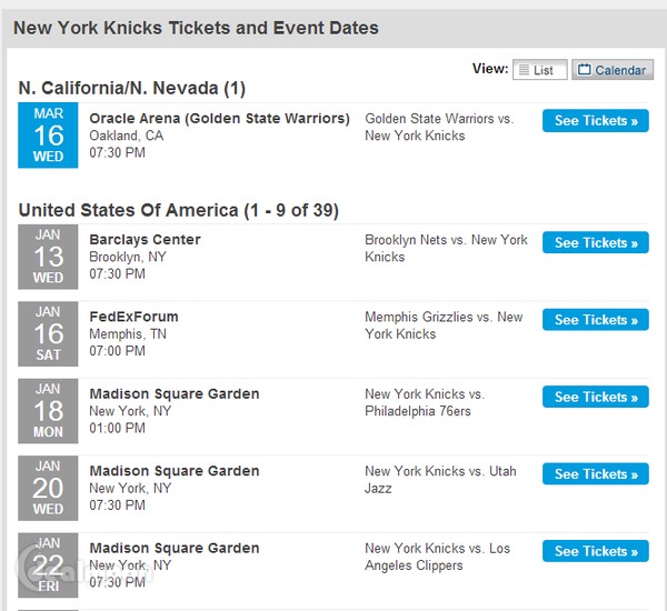 从下图我们可以看到1月22号,纽约尼克斯会在主场麦迪逊广场花园迎战洛杉矶快船队,选择see tickets,就可以进行购买了;注意进入后你会看到Resale即是二手票的意思,有时候一些人因为买了票没办法前去,这些人就会进行resale,价格会根据场次而变动,Ticketmaster对resale票有保护,所以不必担心买到假票。