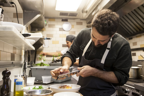 埃斯特拉的主厨伊格纳西奥·马托斯(Ignacio Mattos)正在餐厅厨房里点缀一个盘子。