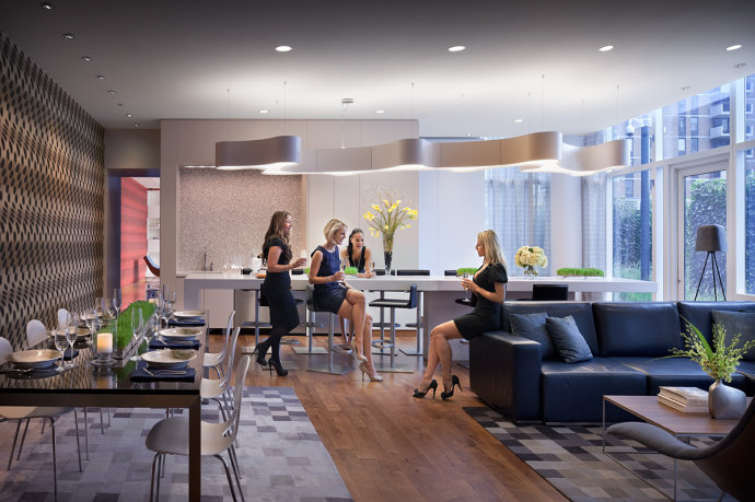 厨具采用德国进口的Gaggenau品牌,是目前最高档的厨具用品。每套公寓配备洗衣烘干机。
