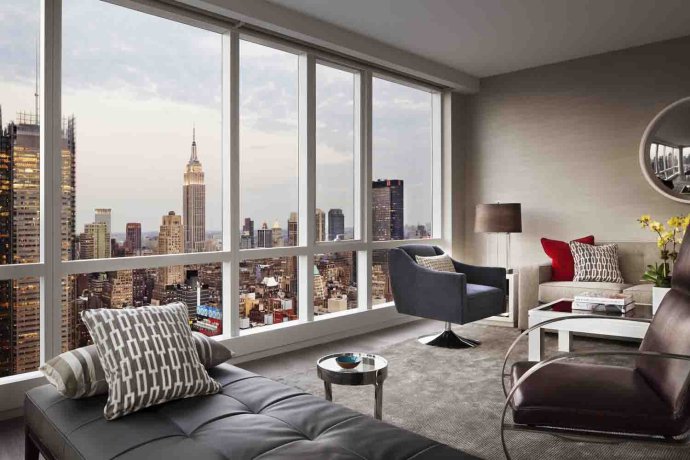 说到景色,可用叹为观止来形容。客厅两个朝向,却东南西北四个方向都能看到,站在客厅真正能感受电影中曼哈顿天际线的震撼,几乎纽约的所有地标都能看到,视野十分开阔,有着强烈的视觉冲击。