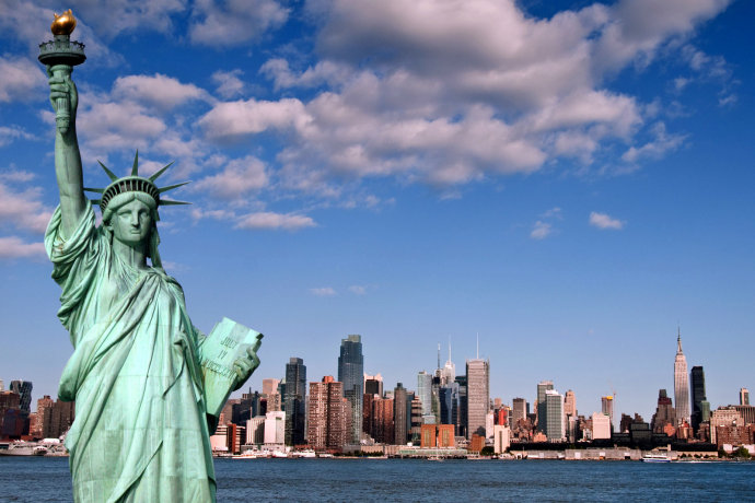 自由女神像(Statue Of Liberty),又称自由照耀世界(Liberty Enlightening The World),是法国在1876年赠送给美国的独立100周年礼物。美国的自由女神像位于美国纽约州纽约市哈德逊河口附近,是雕像所在的美国自由岛的重要观光景点。美国的自由女神像以法国巴黎卢森堡公园的自由女神像作蓝本,法国著名雕塑家巴托尔迪历时10年艰辛完成了雕像的雕塑工作,女神的外貌设计来源于雕塑家的母亲,而女神高举火炬的右手则是以雕塑家妻子的手臂为蓝本。自由女神穿着古希腊风格的服装,所戴头冠有象征世界七大洲及四大洋的七道尖芒。