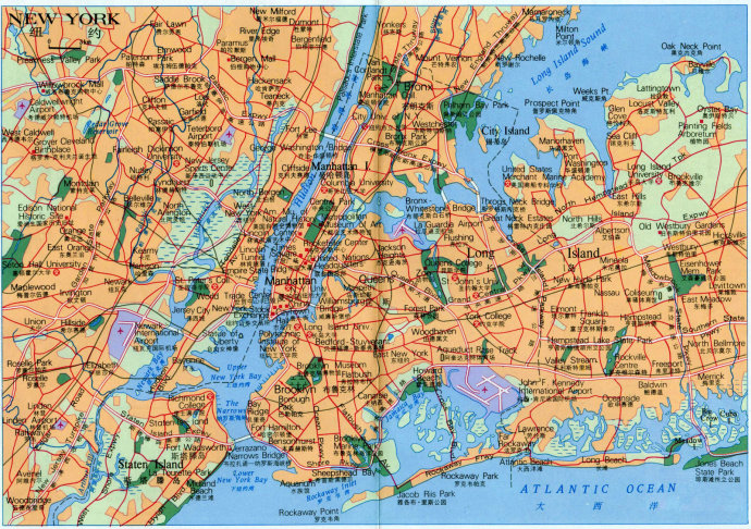 纽约市,濒临大西洋。它由五个区组成:布朗克斯区(The Bronx)、布鲁克林区(Brooklyn)、曼哈顿(Manhattan)、皇后区(昆斯区)(Queens)、斯塔滕岛(Staten Island)。全市总面积达1214.4平方公里。