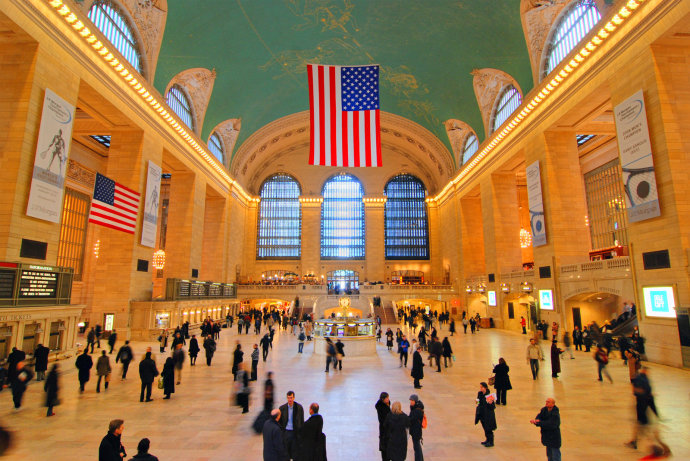 纽约中央火车站享有“世界最美丽车站”的美誉,同时也是纽约市最富盛名的景点之一。穴状的中央大厅里悬挂着用珍贵猫眼石制造的四面钟,可谓是整个火车站的镇站之宝。