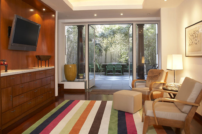 这栋豪宅有五间卧室,六间全卫和两间半卫,还有一个家庭影院,60英尺长的游泳池,禅宗花园,站在阳台上能把中央公园东南角的风景尽收眼底。