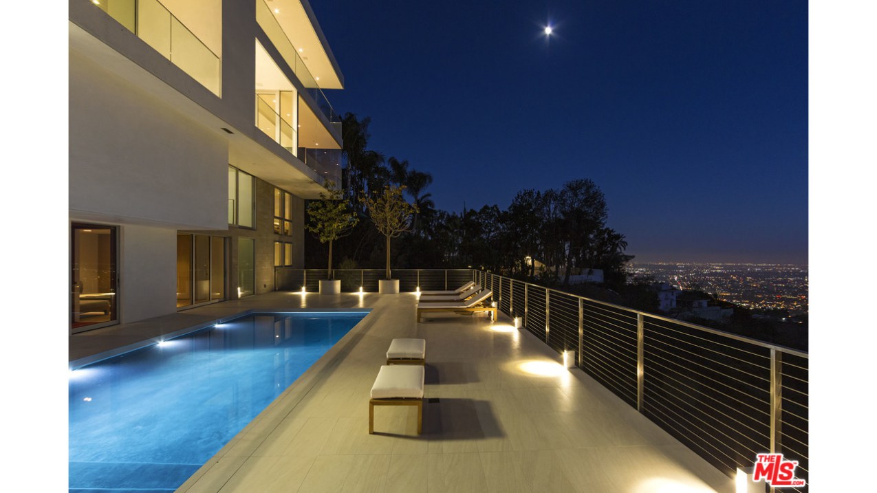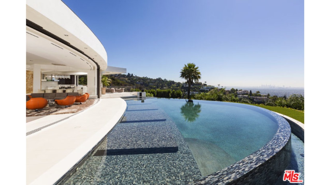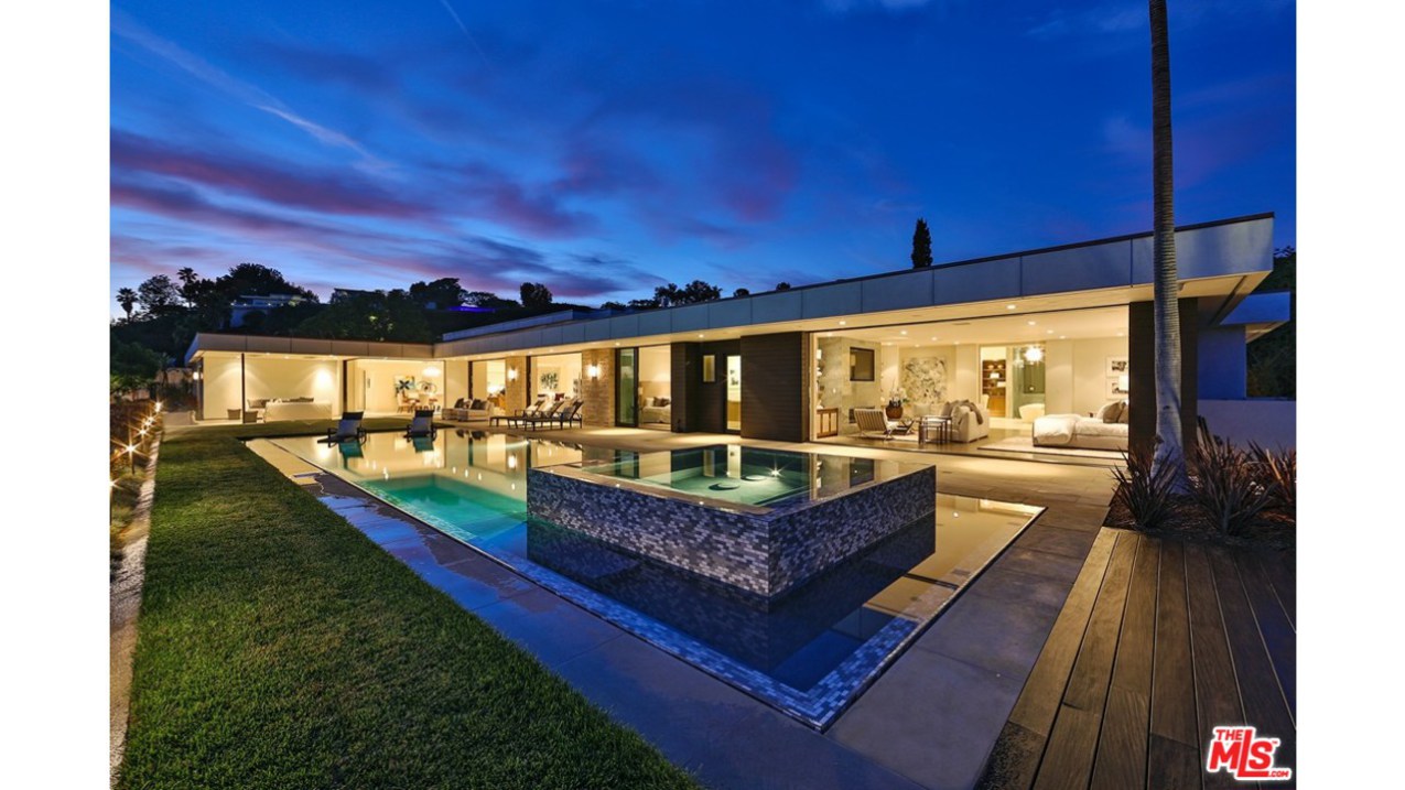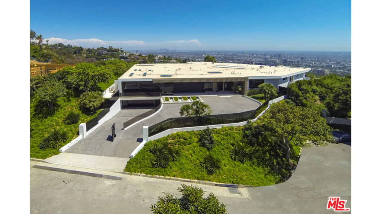 这栋别墅位于明星云集的黄鹂路(Oriole Way),拥有5间卧室、9间浴室,能够俯瞰整个洛杉矶盆地的风景。这栋占地12530平方英尺的豪宅具有鲜明的加州别墅烙印,例如大量的玻璃幕墙、大量的开阔空间以及大量的Fleetwood伸缩门。室内装饰非常精致,使用了许多欧洲进口家居。底楼包括宽敞的主厨厨房、影音室、隐藏式小餐吧、主起居室、办公室、图书馆等房间。度假村式的后院里则有无边泳池兼水疗池,室外厨房以及一个风景独好的用餐、娱乐区域。二楼共有四间卧室,还有面西的一套主卧套间。地下一层则包括待淋浴设施的全尺寸健身馆、酒窖、放映室、会客室以及可以停放八辆汽车的超大车库。