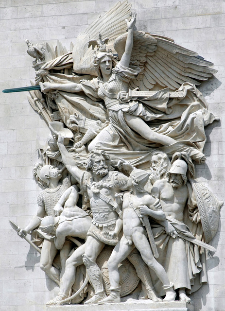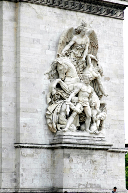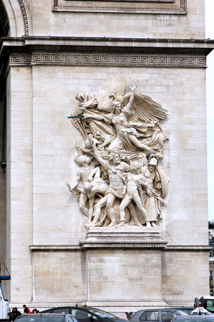 凯旋门右侧门柱的浮雕也被命名为马赛曲。其中象征自由、正义、胜利的自由女神右手持剑,左手高举,号召人民向她指引的方向前进。在她神圣宽广的羽翼下,一群志愿军战士,或高歌猛进,或负重前行,马赛曲的雄壮号角再次响起,映衬着香榭丽舍大道每一天的朝阳万丈和落日余辉。