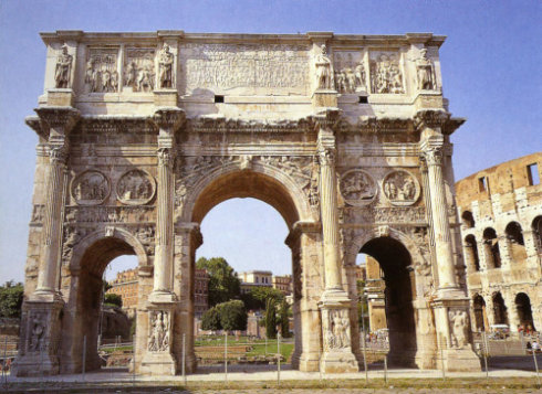 位于斗兽场旁边,有三个拱门。公元315年,为纪念君士坦丁大帝在312年打败一起执政的马森奇奥(Massenzio) 而建造的。这个凯旋门装饰繁多,大多数都是来自以前罗马皇帝凯旋门或其它建筑物的饰物。