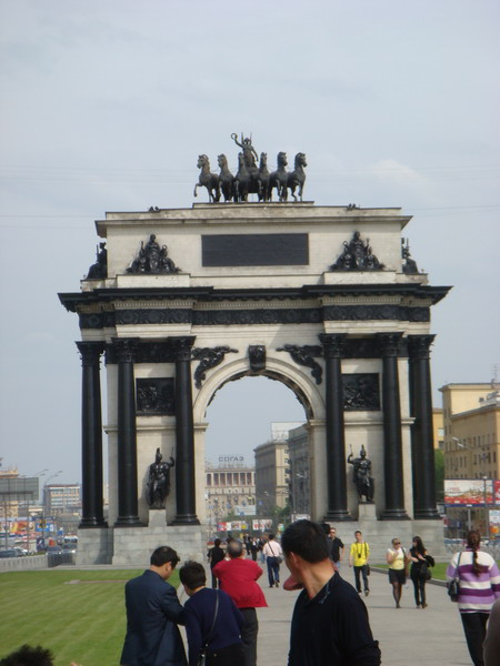 莫斯科的凯旋门建于1829年,历时5年建成。这座凯旋门高28米,,是按照古罗马康斯坦丁凯旋门样式建造。门的基座上共竖立着6组12根圆柱。圆柱用生铁铸成,高12米、重16吨。圆柱之间站立着手持盾牌和长矛的勇士,勇士头顶的墙壁上是反映俄军同法军作战的浮雕。凯旋门顶部安放着6匹背生双翅马拉着的凯旋车,车里坐着胜利女神,她的右手高擎着月桂花环,面向城市入口处。其下武士,手执利剑,或月桂花环和橄榄枝,象征胜利和平。门柱之间,四尊俄军士兵,身披盔甲,手执盾枪,手指上刻着“驱逐法兰西,解放莫斯科”,门楣上饰有抗击拿破伦军队的44个俄罗斯城市的城标。整个凯旋门用白石贴面,在黑色圆柱的映衬下格外醒目。