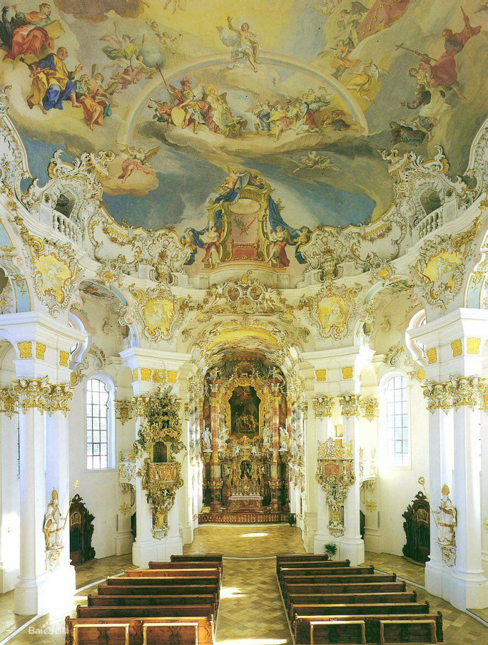 7.大量使用装饰品(通常是镀金、石膏或粉饰灰泥、大理石或人造大理石),巨大尺度的天花板壁画。
