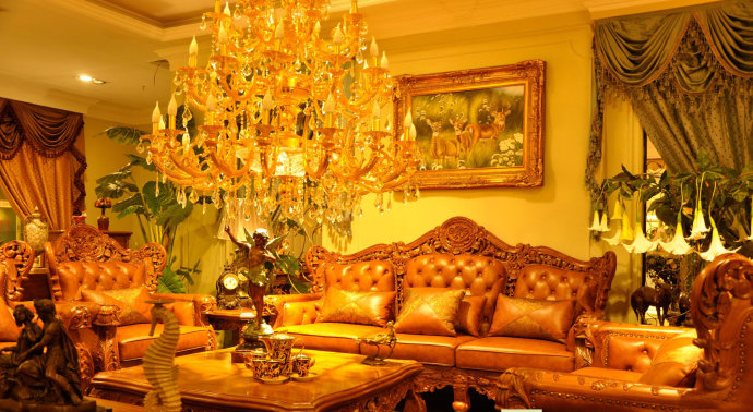 墙面镶以柚木木板或皮革,再在上面涂上金漆或绘制优美图案;天花都会以装饰性石膏工艺装饰或饰以珠光宝气的讽寓油画。
