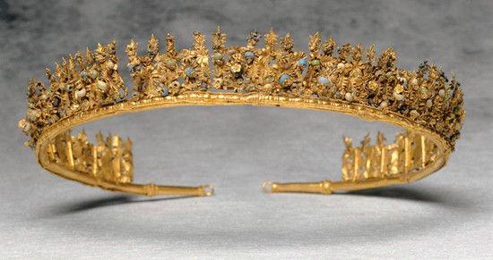 神话般的古希腊皇冠:公元前3世纪。材料:黄金、青铜、玻璃、珐琅)