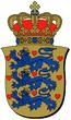 为盾徽。金色的盾面上横置着三只头戴王冠的蓝色狮子,周围点缀着九颗红心。狮子和红心象征勇敢、忠诚、善良。盾上端是一顶华丽的王冠,象征丹麦是一个古老的王国。